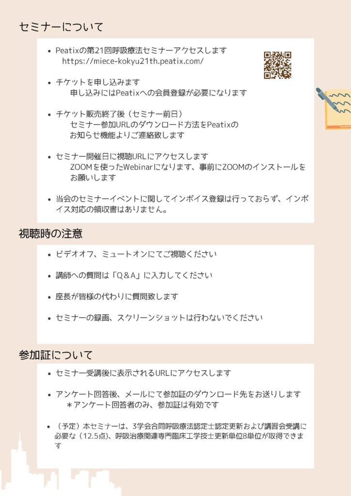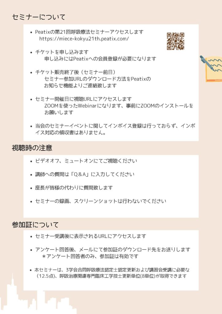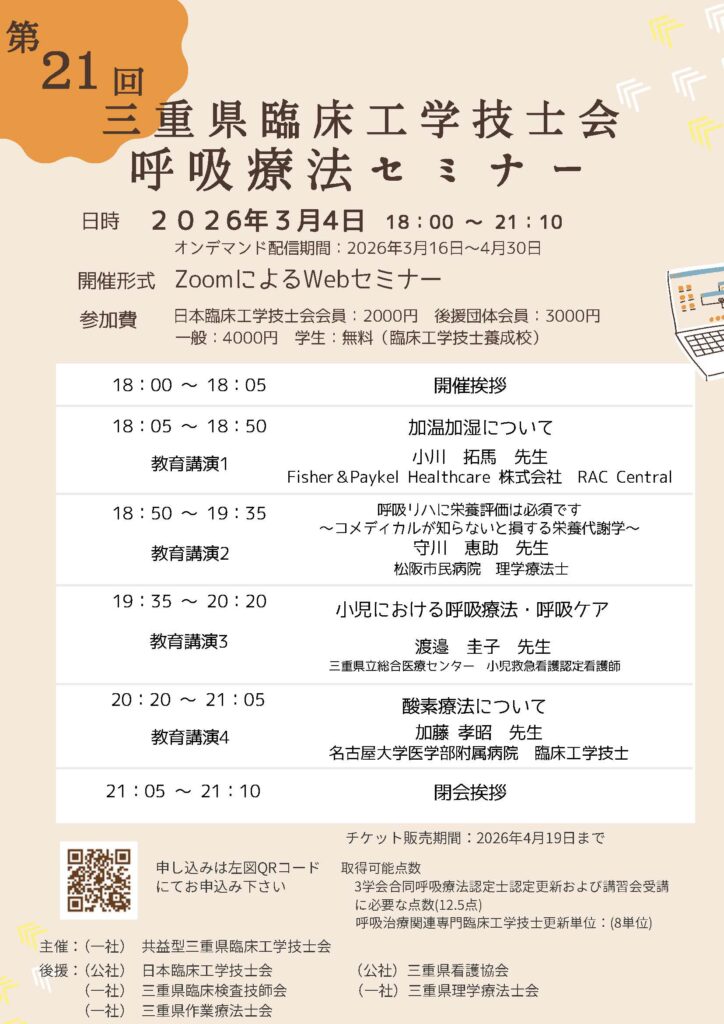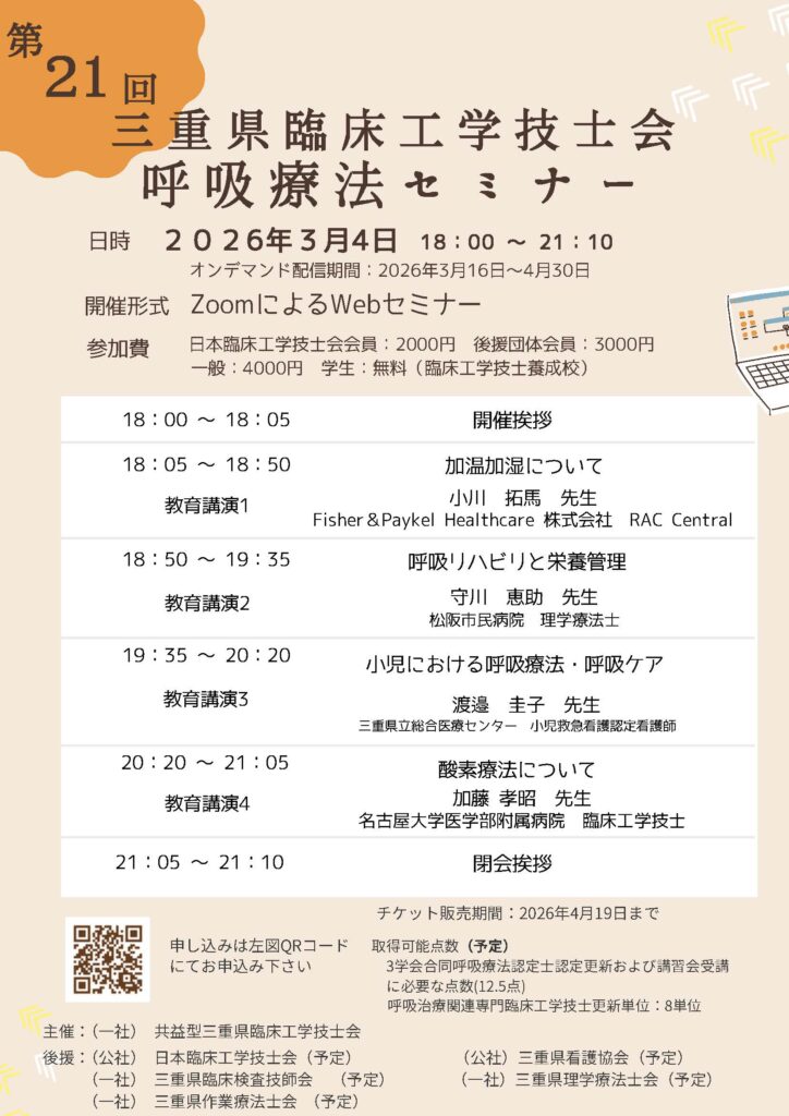 HOME > 講習会・セミナー > 三重県 CEセミナー > 三重県CEセミナー記事スライド用 > 第21回呼吸療法セミナー 2025年12月18日 各種ご案内 第21回呼吸療法セミナー.pdf Post Share LINE